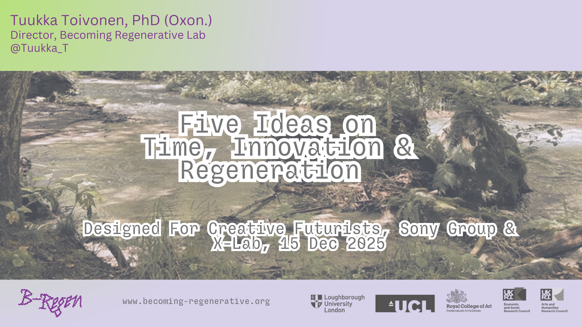 そこで本日は、ゲストとしてトゥーッカ・トイボネンさんをお招きしました。トゥーッカさんは「Becoming Regenerative Lab」をリードされており、私もアドバイザーとして活動を一部ご一緒しています。イギリスと日本の両拠点をブリッジしながら活動されている方です。それでは、トゥーッカさんに最初のレクチャーをお願いしたいと思います。よろしくお願いします。