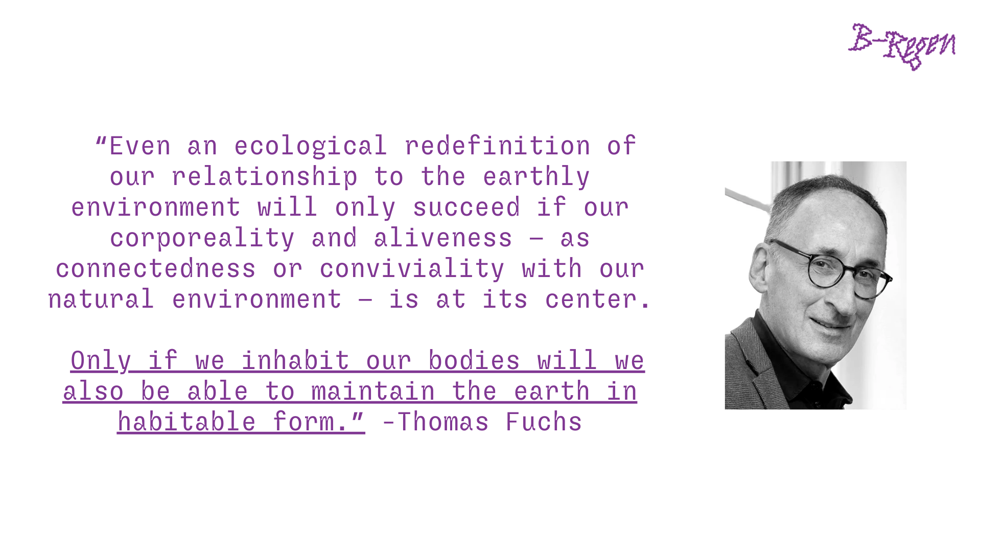 ここでドイツの心理学者であり哲学者でもあるトマス・フックス(Thomas Fuchs)を紹介したいと思います。彼はエコロジカルな脳科学を推奨していますが、「自分たちの身体感覚で生きていなければ、地球とも繋がれないし、地球を住みやすい形でも保てない」と提案しています。個人的にも本当にその通りだと思っています。