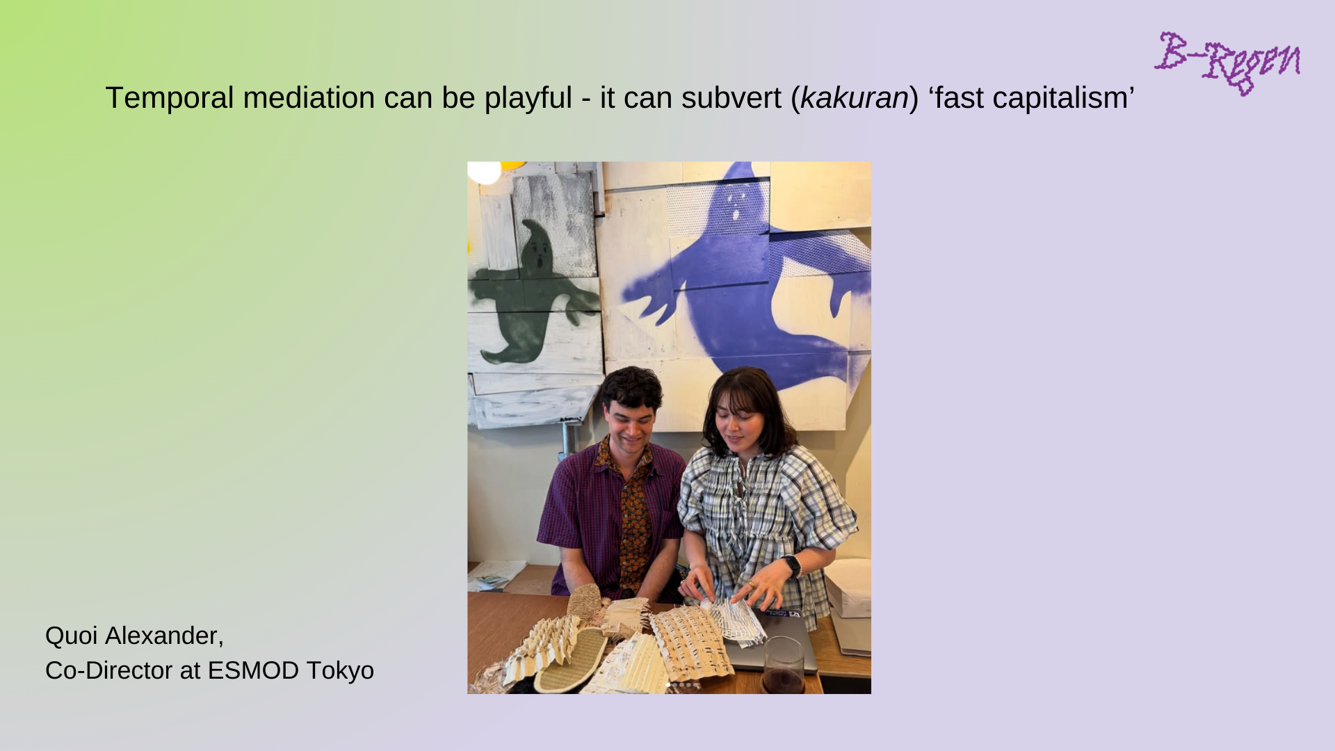 こうした「時間性の仲介」は、実はすごく遊び心を持ってできることなんです。僕のコラボレーターであるコイ・アレクサンダー(Quoi Alexander)は、国東半島の伝統を研究した上で、あえて「使い捨てていい草履」を作りました。地域の素材で作られ、土地に置けばそのまま溶け込んでいく。これは、速すぎる「ファストファッション」という経済を、遊び心を持って内部からハックし、撹乱しようとする試みです。