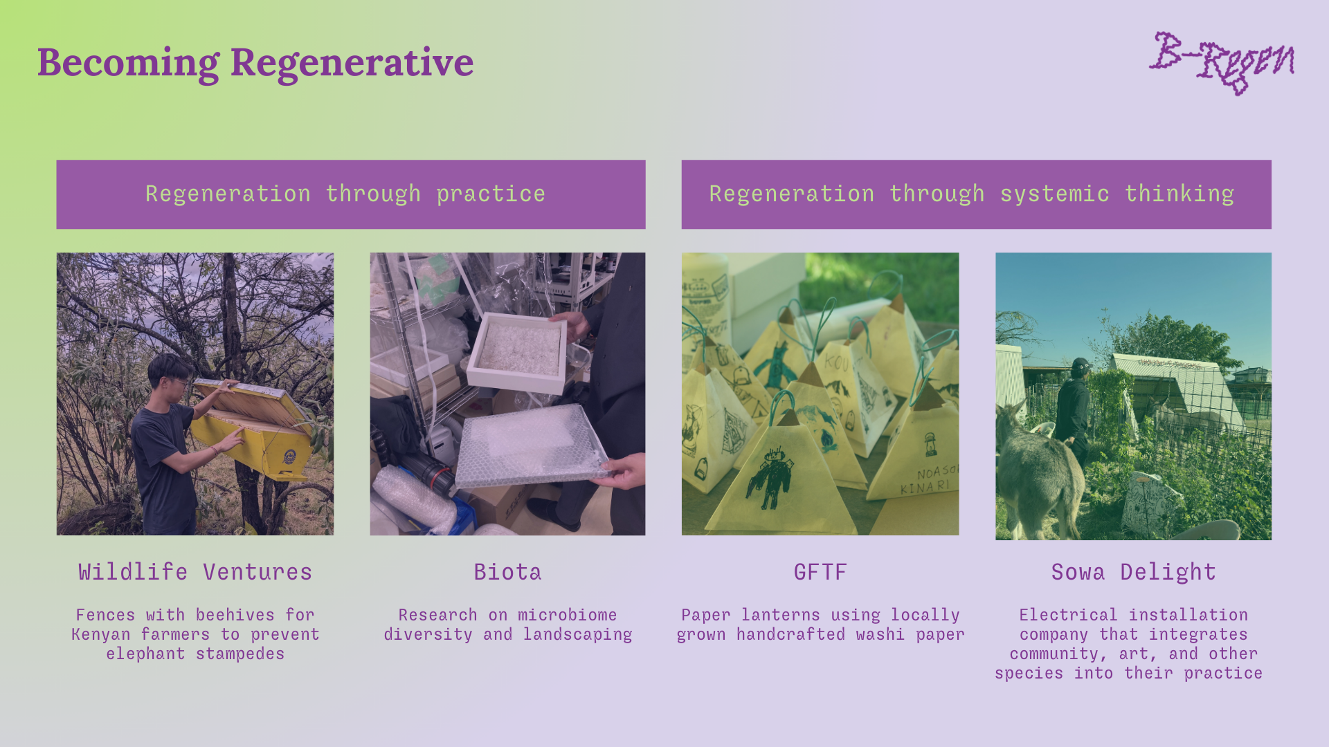 では、なぜこの研究が必要なのか。それは、「リジェネラティブ」に関する理論や教科書的なものは多いけれど、実際にラボを超えてアイデアが企業という形式をとったとき、実社会でどう実行され、成長していくのかという研究がほとんどないからです。僕たちが研究対象にしているのは、ナノセルロースでスニーカーを「育てる」Modern Synthesisや、藻類を使ってプラスチック代替マテリアルを作るNotplaといったスタートアップです。日本でも、都市の微生物の多様性を高めようとするBIOTAや、8世代・1500年以上の歴史がある神社の伝統を紡ぐソウワ・ディライトなど約10社を見ています。そういった企業の事例を追いながら、実社会の研究を進めています。